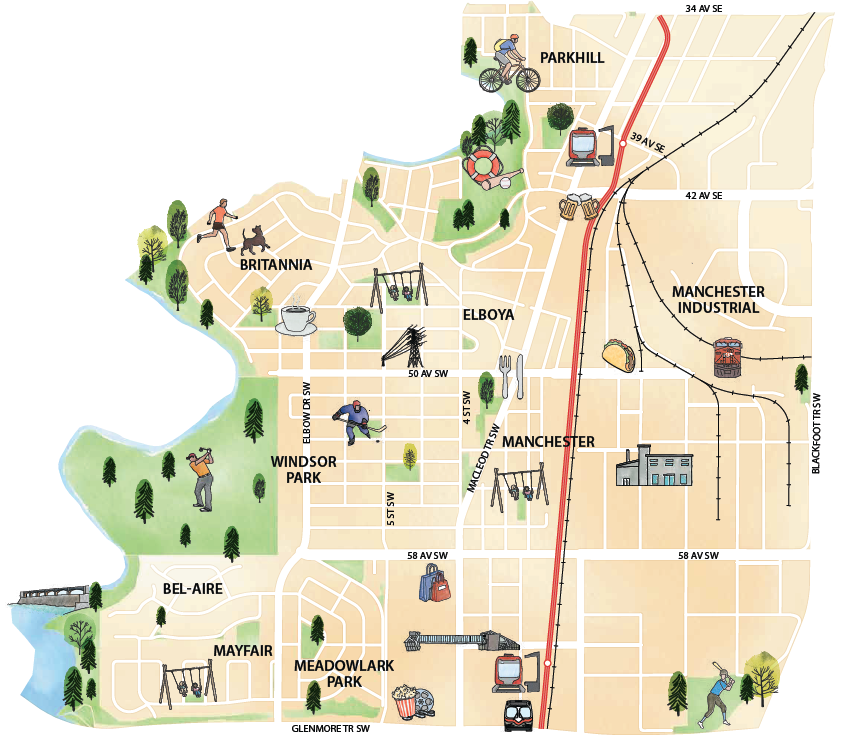 The Chinook Communities Local Area Plan includes the neighborhoods of Elboya/Britannia, Parkdale, Windsor Park, Meadowlark Park, Mayfair/Bel Aire, Manchester and Manchester Industrial.